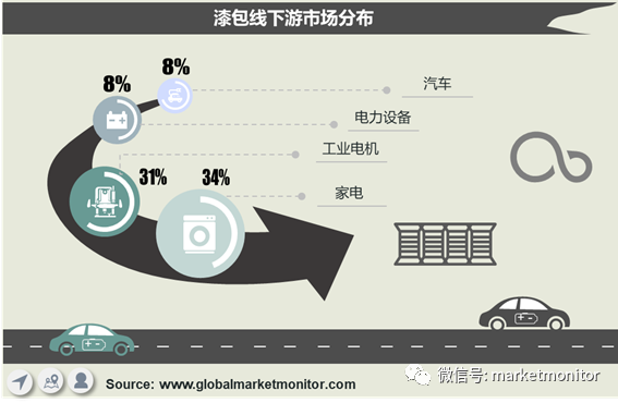 漆包线是电器、电机、电子电网等领域的核心原材料。随着国内工业基础不断加强以及终端应用的多元化,传统漆包线已经经历了快速增长期。中国企业已经在这一领域占据相对优势的地位,国内产能占全球产能的50%。其中,下游市场主要包括家电、工业电机、电力设备以及汽车行业。